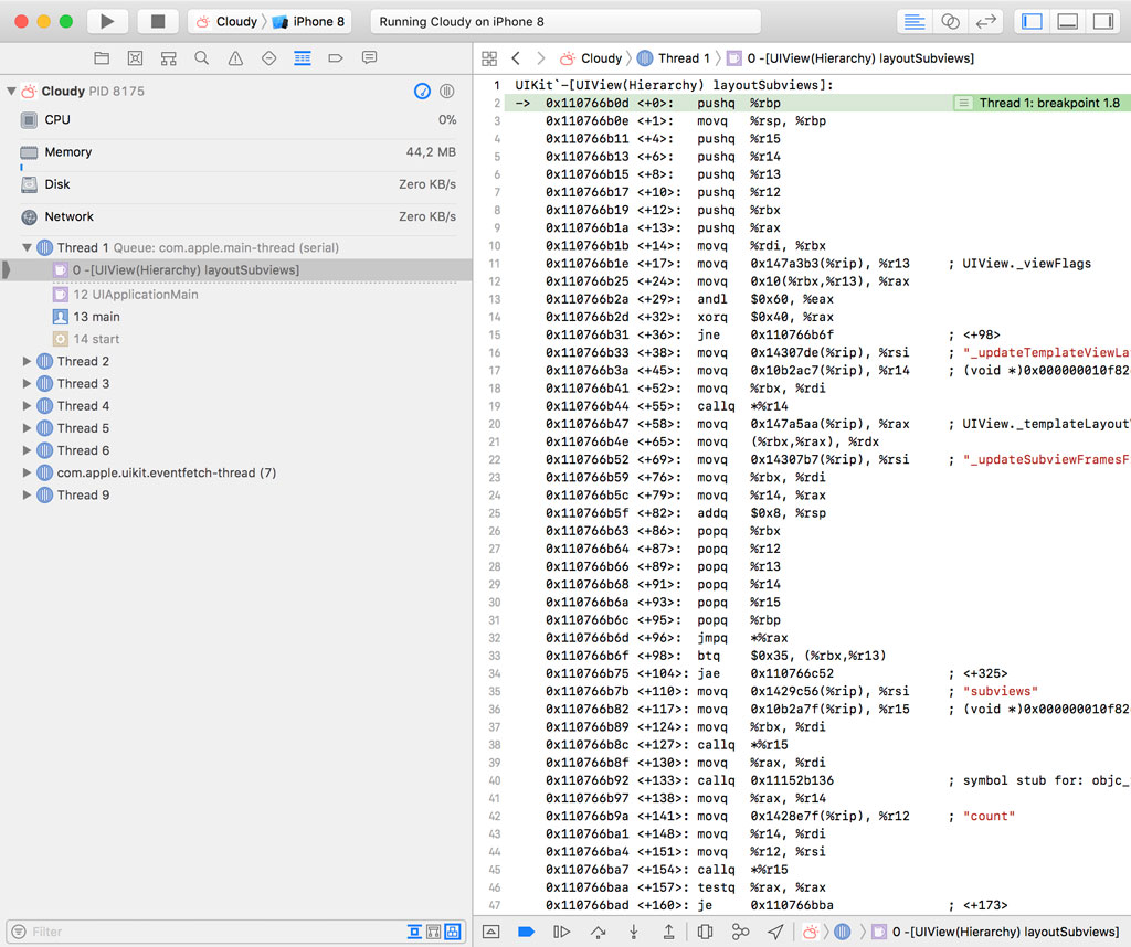 The debugger pauses the application and the stack trace in the Debug Navigator shows us why. The stack trace isn't very useful, but it shows that the debugger paused the application on the layoutSubviews symbol.